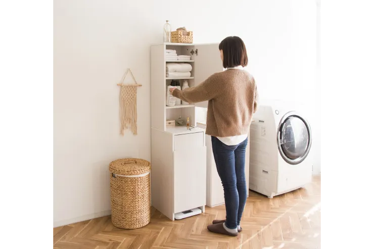 わずかなスペースにたっぷり収納できて、洗濯カゴも出し入れ簡単なので洗面台や洗濯機の隣にあれば活躍間違いなしです。