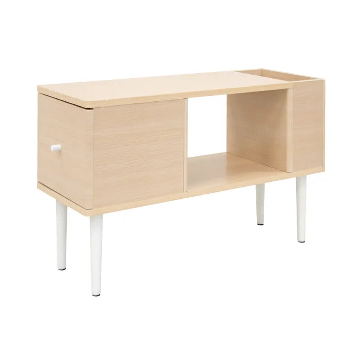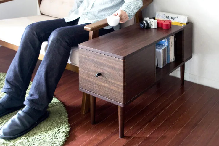 引き出しやブックスタンド付きのたっぷり収納ですが、スリムで場所を取らず、ソファサイドやベッドサイドにピッタリ!